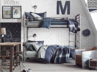 - Интериор в стил минимализъм и таванско помещение ще бъде перфектно допълнен от метални двуетажни легла, които ще добавят желаната ъгловост.