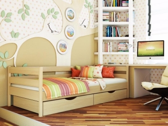 За по -големи деца производителите предлагат опции за ярки цветове с изображение на цветя, слънце, риба, анимационни герои и други цветни рисунки. И дори самото легло може да бъде направено под формата на кола или приказен вагон..