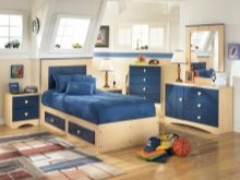 Синя тахта с облицовка от еко кожа е универсален вариант за тийнейджър. Декорирането на стаята в студени цветове създава усещане за свежест и спокойствие. Веселите снимки придават чар и детска спонтанност на стаята.