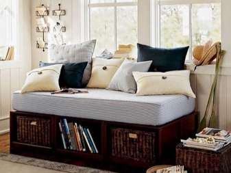 В зависимост от размера на кутиите, можете да поставите не само спално бельо в тях, но и други неща. Ако има недостиг на свободно пространство, такова място за съхранение може да се използва като скрин. В детската стая чекмеджетата са полезни за играчки и канцеларски материали. Възрастните могат да съхраняват дрехи в тях.