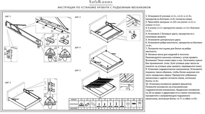 - Сглобете основата на леглото, поставете краката. Завийте повдигащия механизъм (ако има такъв).