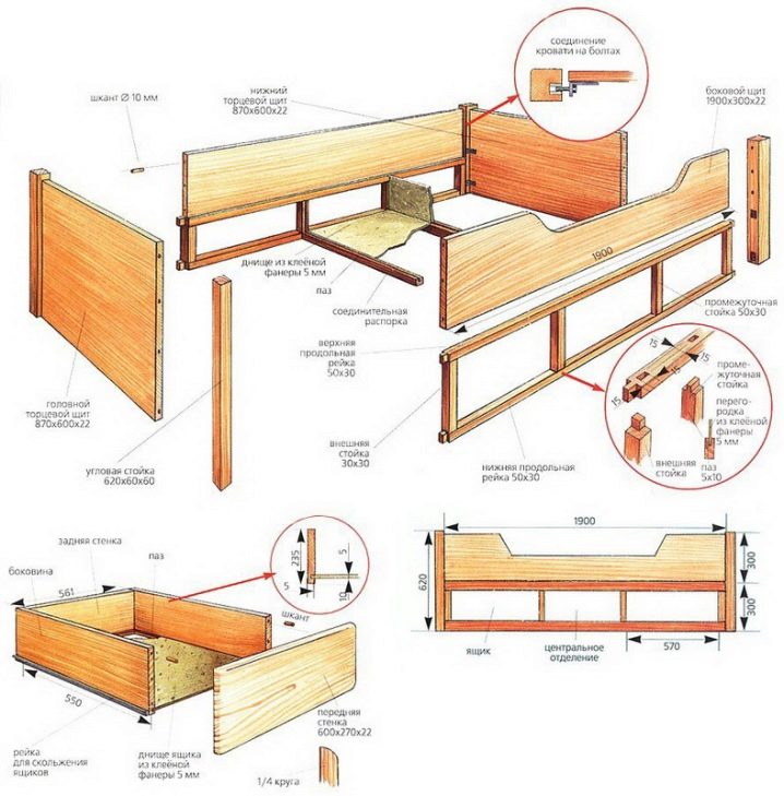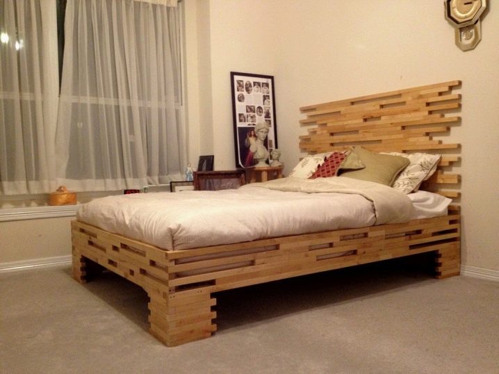 За да направите сами легло и половина от решетките, трябва да направите няколко елемента: външна рамка, щайга, както и табла и странични части, които могат да бъдат декоративни. На първо място, ще трябва да придобиете масивно дърво, за да завършите външната рамка на леглото. Ще ви трябват и дървени блокове с различна дебелина и декоративни елементи. Най -лесният начин е да направите легло без крака със собствените си ръце, вместо тях опората ще бъде удължените части на рамката в ъглите на тази мебел.