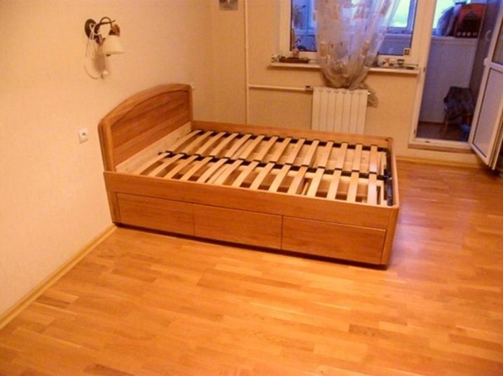 Първо, трябва само да направите правоъгълна кутия, като фиксирате всички компоненти на рамката с самонарезни винтове. След това трябва да проверите колко правилно са съединени всички ъгли, след проверка трябва да ги подсилите с метални ъгли. След това по целия периметър на рамката отвътре е необходимо да фиксирате решетките, а върху тях дървени дъски, върху които по -късно ще поставите матрака. Разстоянието между ламелите трябва да бъде около 3 см. Ако искате да украсите леглото по някакъв начин в основата му, трябва да го украсите на този етап.