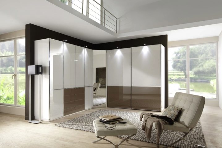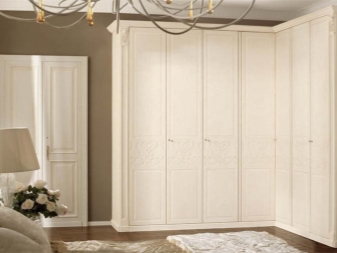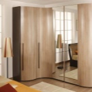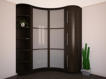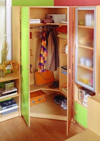 Такива модели се инсталират в големи помещения. Ъглов шкаф е разположен по протежение на две съседни стени, но едната част от него обикновено е по -голяма от другата, така че поставянето на такъв продукт трябва да бъде внимателно планирано. Малки и тесни ъглови шкафове обикновено се използват в офис помещения, тъй като не са много удобни за съхранение на дрехи за постоянно..
