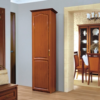 Ако решите да инсталирате гардероб в хола, тогава дайте предпочитание на не много претенциозна слушалка в класически стил. Подходящи са продукти от обикновена пластмаса в задържани цветове или традиционни дървени конструкции.