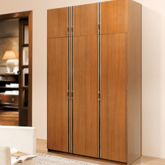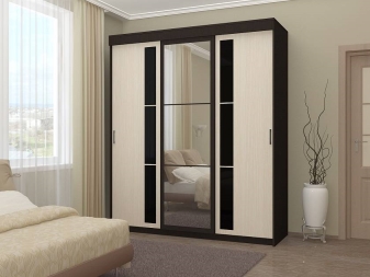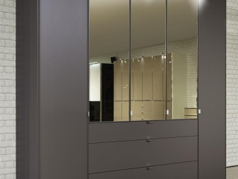 - Модел с три листа не е като с две врати, тъй като има по-просторно отделение за връхни дрехи и е оборудвано с чекмеджета в долната част. Тези чекмеджета са разположени под ниша с щанга и често са чудесно място за съхранение на обувки или различни продукти за лична хигиена. Често гардеробът с три врати е оборудван с огледало, което се намира в средното крило на вратата. В този случай и двете зони под страничните панели са оборудвани с чекмеджета, а шкафът има различна вътрешна структура..