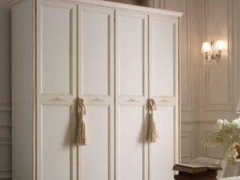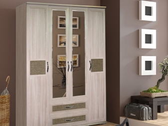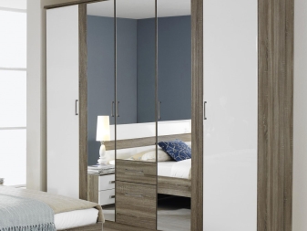 - Гардероб с четири листа е доста обемист продукт. Но понякога отделенията му са доста компактни и самият той е напълно елегантен дизайн. Тя може да се състои от две еднакви отделения едно до друго. Друга възможност за оформлението му е голямо отделение в центъра и няколко малки отстрани. Често в горната и долната част на шкафа има допълнителни чекмеджета и рафтове..