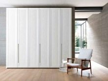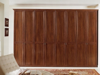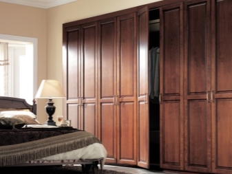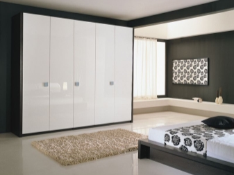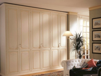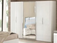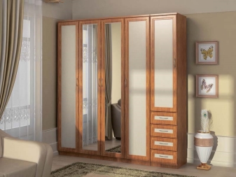 - Гардероб с пет врати е интересен дизайн, който включва пет или четири основни раздела. Понякога една секция комбинира ниши с бар и рафтове за съхранение на малки предмети. В противен случай гардеробът с пет врати може да включва отделение, направено по подобие на скрин. Отвън трите средни секции са направени с огледални врати или завършени в различна цветова схема.