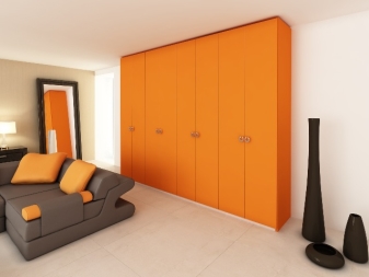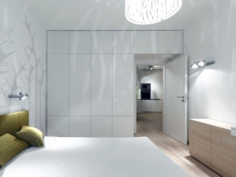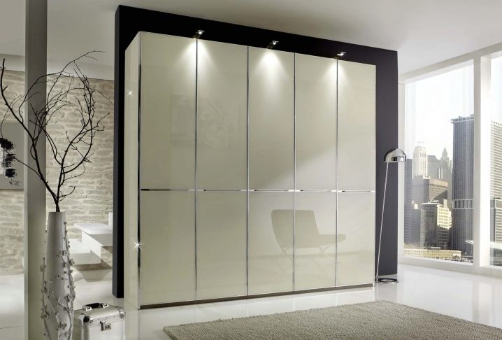 Ако планирате да инсталирате шкаф в цялата стена, тогава оригиналното решение би било да създадете вътрешно осветление в него. Ако вградите крушки с ниска мощност във всяко листо, можете да създадете необичаен ефект. За това е важно самият гардероб да се слее с цвета на стените. Но можете да направите такъв ход в продукт, който е с контрастен цвят..
