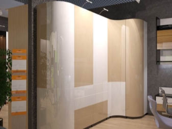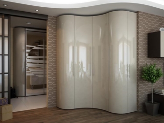 Радиалните люлеещи се шкафове, въпреки големите си размери, изглеждат по -компактни от стандартните модели. Такива продукти имат изпъкнала вдлъбната форма и гладки линии. Те нямат остри граници или ъгли. Много често тези модели се намират в ъглов формат..