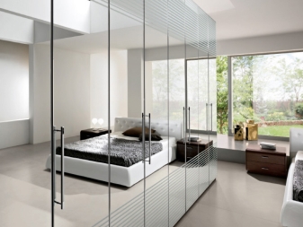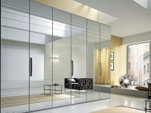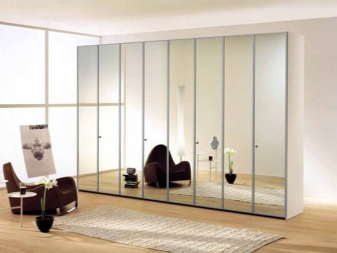 Има отлични дизайнерски решения за декориране на врата на шкаф с огледало. Тя може да заема цялата повърхност на вратата или само горната й част. Често огледалото от една част е разделено на отделения с умишлено подчертани фуги между тях, за да изглежда дизайнът по-оригинален. Големите огледала се доставят с матов дизайн или композиции от цветно стъкло.