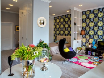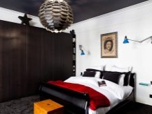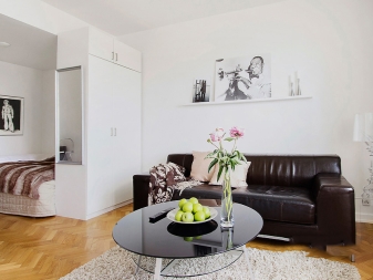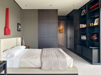 Голям шкаф с люлеещ се шкаф понякога се използва в интериора с цел зонално разделяне на помещението. Линейният дизайн, който е в хармония по цвят и стил с общия декор на стаята, не изглежда груб или грозен, като е границата на две зони.
