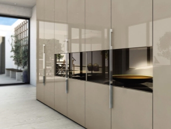 Стъклото често се вгражда във вратите на люлеещите се шкафове. Тя може да бъде матова и прозрачна. Шкафовете със стъклени вложки са идеални за хола, в тях се съхраняват съдове, книги или други интериорни атрибути.