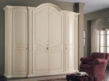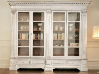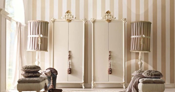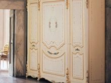 За луксозния барок са подходящи продукти от естествено дърво, които изглеждат солидни и солидни. Ръбовете на крилото са снабдени с дърворезба и странични пиластри. Характеристика на класиката е подреждането на шкафове не на нивото на пода, а малко по -високо, поради което повечето продукти са оборудвани с крака. В цветовете се предпочитат светлите нюанси, на бели или кремави врати, рисунки и орнаменти често се правят с добавяне на пастелни тонове.