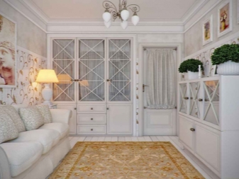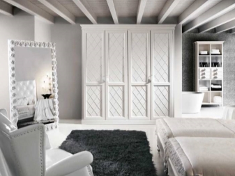 Концепцията за стила shabby chic напомня за бароковия стил, тъй като белите мебели са разположени на краката. Но незаменим атрибут на тази посока ще бъде дизайнът на шкафа с помощта на чертежи на вратите. Важен елемент е наличието на розово в мебелите, понякога дори покрива целия гардероб. Вратите на шкафовете са украсени с допълнителни елементи като лъкове, плитка и дори тапицерия.
