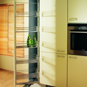 Високите шкафове рядко се инсталират в кухнята, но това не означава, че не можете да изберете такива мебели за себе си. Молив с определено оформление органично ще се впише в кухненската среда. Не заема много място и е идеален за съхранение на кухненски прибори.