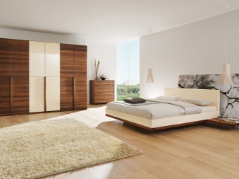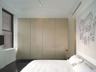 Малка спалня. Комбинацията от тъмния цвят на гардероба и светлия цвят на стените не прави стаята по -малка, но изглежда хармонично и спокойно.