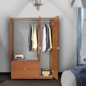 Стандартните гардероби с две и три врати ви позволяват да съхранявате много повече дрехи. Отворът тук може да бъде люлеещ се или плъзгащ се. Тази мебел има много отделения за различни видове дрехи. Винаги има секция с рафтове и чекмеджета, както и отделения, оборудвани с бар, който може да се движи по протежение на или през шкафа. Напречното разположение ви позволява да съхранявате много по -голямо количество неща на закачалки. В съвременните модели гардероби прътите са оборудвани с пантографна система, тоест те се плъзгат навън и навътре, издигат се и падат.
