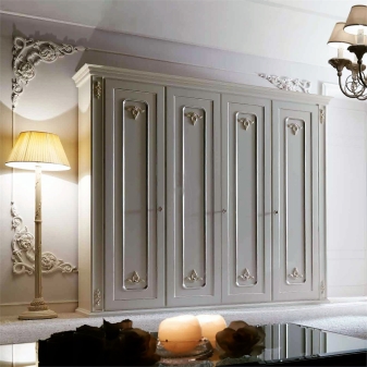Класическият гардероб е монтиран на цокъл, благодарение на който мебелите лесно се плъзгат към стената с цокъл. Стилизирани гардероби се правят на крака.