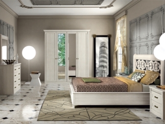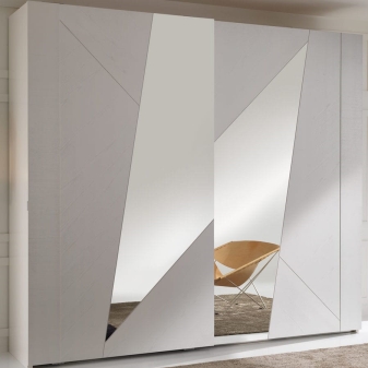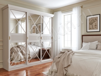 Огледалният гардероб е направен в класически стил. Поради белия цвят, той сякаш се разтваря във вътрешността на спалнята, като същевременно остава важните й функционални и декоративни елементи..