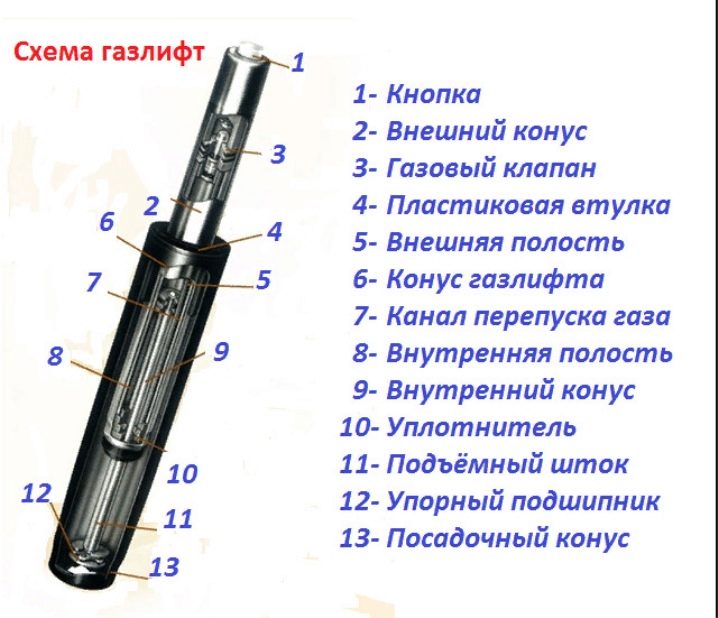 - Цилиндърът, в който се намира газът. Контейнерът често се пълни с азот. Трябва да се отбележи, че сместа вътре е под много високо налягане, така че не се препоръчва да разглобявате газовите асансьори сами..