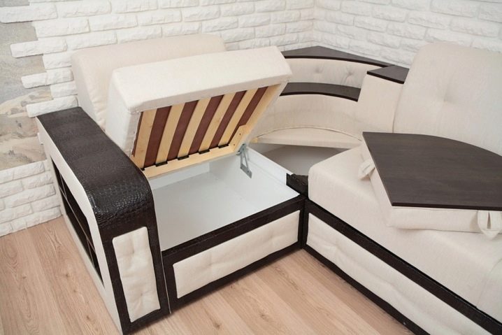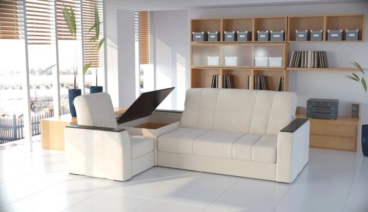Здрав капак се издига над седалката. По този начин получавате не само диван, но и масичка за кафе. Подлакътниците също имат твърда повърхност. Те могат да се използват като подложки за чаши. Тапицерията е плат, кожа. Всичко ще зависи от категорията пълнител, пружинен блок, размер, завършек. Съответно цената ще зависи от тези показатели..