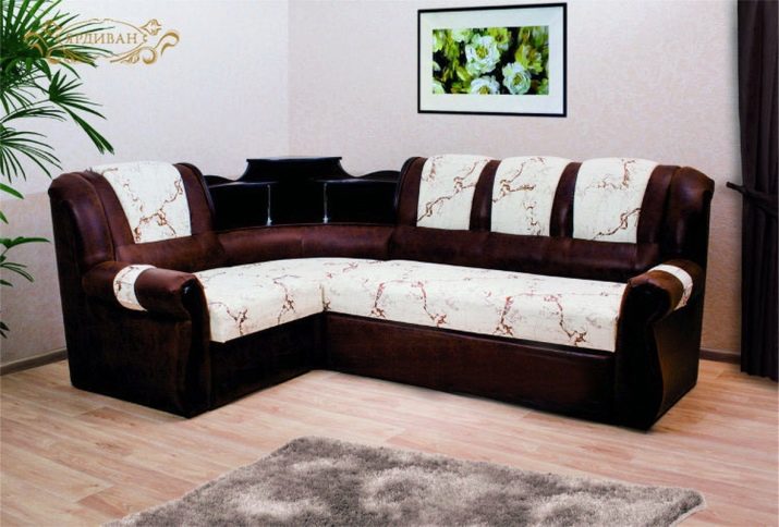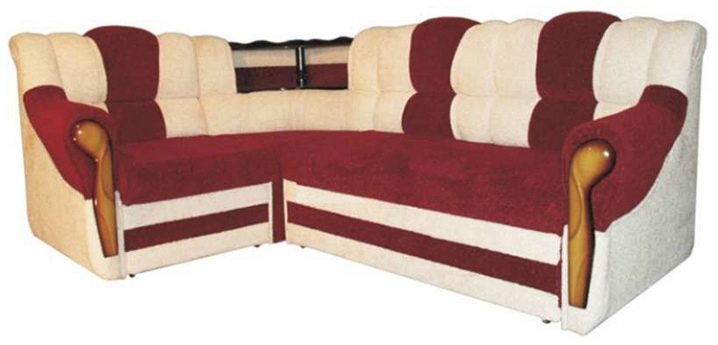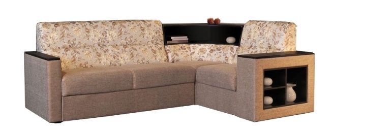 Този ъглов диван има два удобни рафта. Предимствата на продукта включват факта, че продуктът се произвежда в различни цветови вариации. Клиентите често предпочитат мека вълнена материя в няколко контрастни тона. Тази комбинация придава на мебелите богат вид. Диванът е доста мек и удобен. Затворените рафтове са разположени в ъгловия сектор. Сгъваемият механизъм е от типа “делфин”. Има и чекмеджета за продуктите, от които се нуждаете..