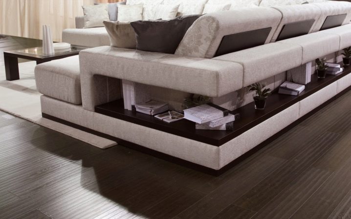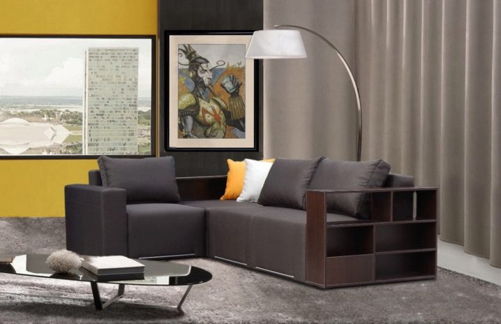 - Ако изберете голям ъглов диван, той може да бъде оборудван с много рафтове.. Те ще помогнат не само за удобно съхранение на различни предмети, но и ще се превърнат в стилно допълнение към вашия интериор..