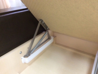 - С газов амортисьор. Най -модерният повдигащ механизъм, където вместо конвенционални пружини се използва газов амортисьор, задвижван от сгъстен въздух. Устройството е издръжливо, докато повдигането се извършва гладко и издържа на доста голямо тегло – до 80 кг. Механизмът се привежда в движение лесно, без усилие, дори дете може да го използва. Сред недостатъците е доста висока цена..