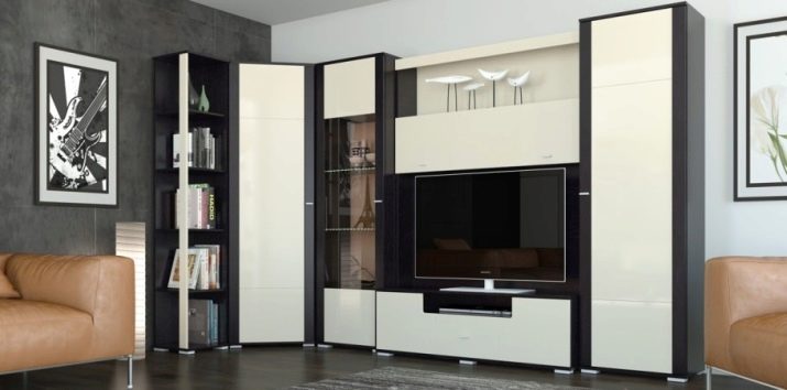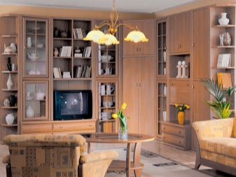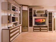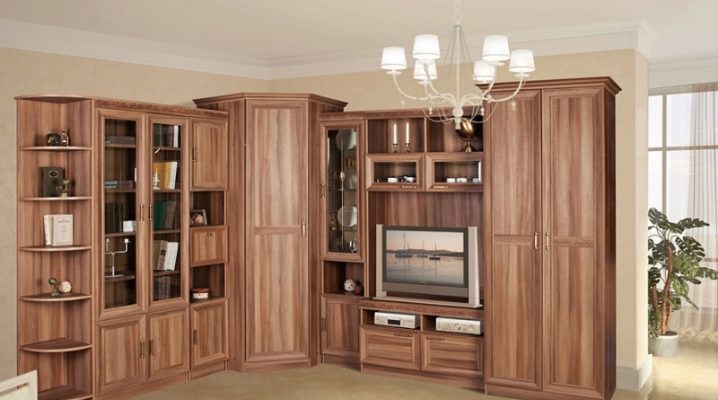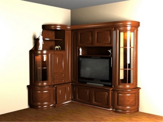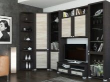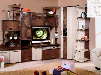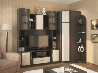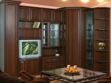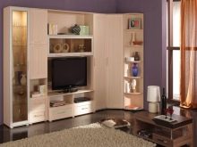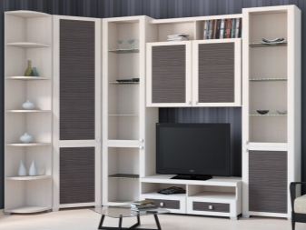 За залата можете да вземете ъглови стени по поръчка. Разбира се, тази опция няма да бъде евтина. Но ще бъдете сигурни, че ще подхожда на вашия апартамент. В същото време можете да поръчате най -креативните облицовки от дизайнерите. Ако искате да спестите пари и да закупите готови модели, тогава можете да закупите ъглова модулна версия. Тя ще изглежда хармонично във всяко пространство. Обикновено такава стена има бордюр, където можете удобно да позиционирате телевизора..