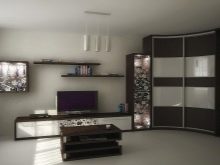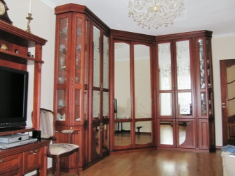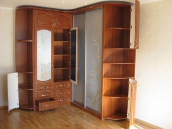 - За тези, които обичат креативния дизайн, има радиус ъглова стена. Има меки, опростени линии. Често такива опции се поръчват за коридори или спални. Продуктите с просторно вътрешно пространство ще ви позволят да съхранявате различни неща и предмети.