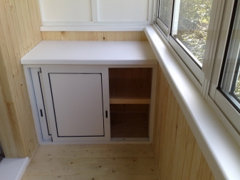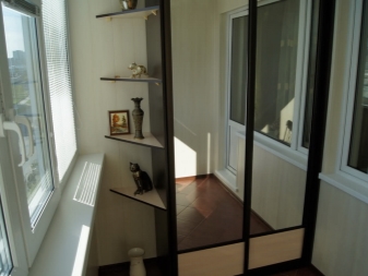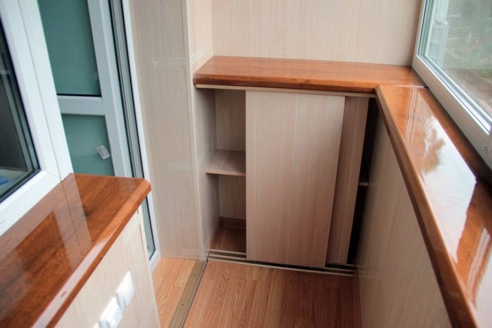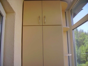 Такива модели ще помогнат за ефективно запълване на ниша в балконското пространство. Това ще ви помогне да спестите място. Трябва също така да се отбележи, че шкафовете могат да имат врати. Уютът и лекотата на използване на мебелите също ще зависят от това. Например модел с шарнирни врати обикновено се предпочита от ценителите на класиката. Това може да бъде стилен и просторен ъглов гардероб. Неговият недостатък обаче е невъзможността да се използва пространството, заето от отворена врата. В същото време предимствата включват плътно затварящи се врати, практичност и издръжливост. Отваряйки такъв шкаф, веднага ще видите съдържанието му, така че ще бъде по -лесно да намерите определено нещо..