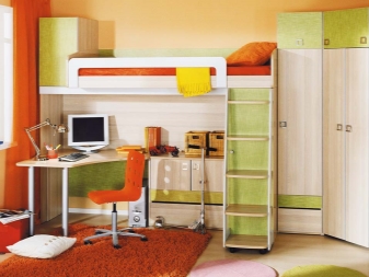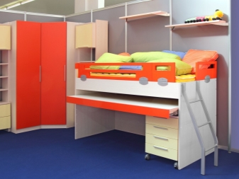Днес тази опция е модерна и доста привлекателна. Тук се използват два вида строителство. Има легло на таванско помещение и ъглов гардероб отдолу. Или може да бъде пълноценна стена с маса и гардероб, където детето ще съхранява нещата си. Първите опции са чудесни, ако имате малка детска стая. Втората версия ще бъде доста практична, ще помогне да се създаде единен стил на стаята..
