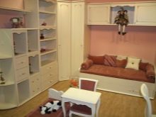 В детската стая можете да инсталирате висок гардероб близо до тавана, ако, разбира се, размерите на стаята позволяват. Можете да поставите всички необходими неща там. Подходящ е за дрехи и играчки..