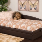 - “Yuma” от производителя Toris. Двойно легло с дървена ъглова табла, повдигащ механизъм и просторно отделение за съхранение. Такъв продукт се произвежда главно от масивен бор, дъб или бук.