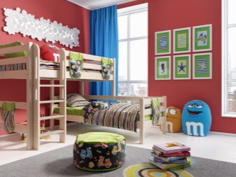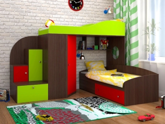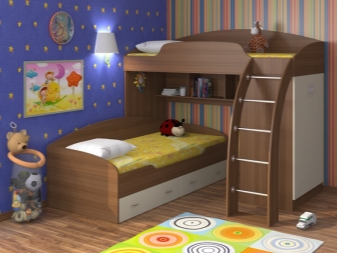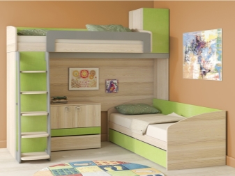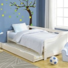 - Детски легла. Мебелите имат страничен гръб, така че детето да не пада на пода, докато спи. Другата страна може да се обърне към леглото, стената на родителите или да се постави нощно шкафче. Често мястото за спане е украсено с животни, цветя или други интересни елементи..