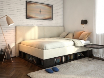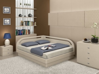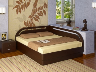 - Страните могат да бъдат оборудвани с рафтове, на които можете да поставите настолна лампа, книги, телефон и др. Това ви позволява да освободите място, като премахнете нощното шкафче или други мебели. Вярно е, че този модел може да бъде поставен само в ъгъла на стаята, защото в центъра ще изглежда обемист и непривлекателен..