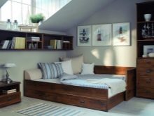 - Разтегателно легло. Този модел е идеален за отпускане на възрастни, защото лесно можете да направите две от едно легло. Изглежда масивно, но има предимство: наличието на отделения за съхранение на вещи.