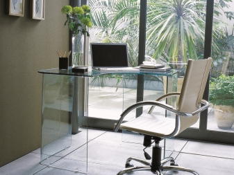 - Малък недостатък на този тип мебели може да се дължи на следното: тъй като е изработена от стъкло, повърхността е студена, тъй като този материал има висока топлопроводимост. Това обаче изобщо не е причина да не купувате стъклени мебели за работното място..