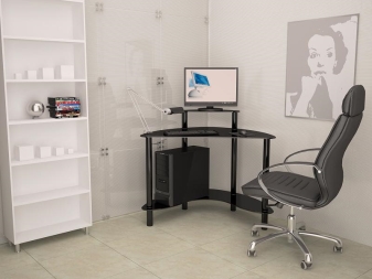 - Ъглова стъклена маса за компютър или лаптоп перфектно ще хармонира със съвременните стилове. Такива мебели ще изглеждат най-изгодни в технически стил, стилове на хай-тек и минимализъм, както и в някои други..