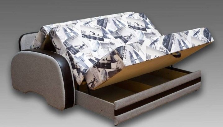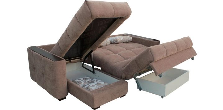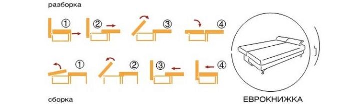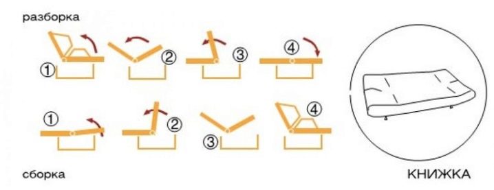 Разтегателен модел с проста система: секцията се разточва изпод седалката, основата се повдига, ненужните възглавници на дивана се изваждат в чекмеджето за спално бельо, рогозките с пълнител се подреждат според принципа “Книги”.