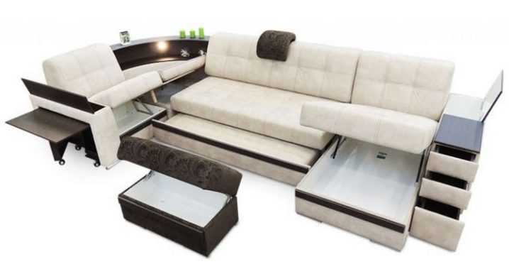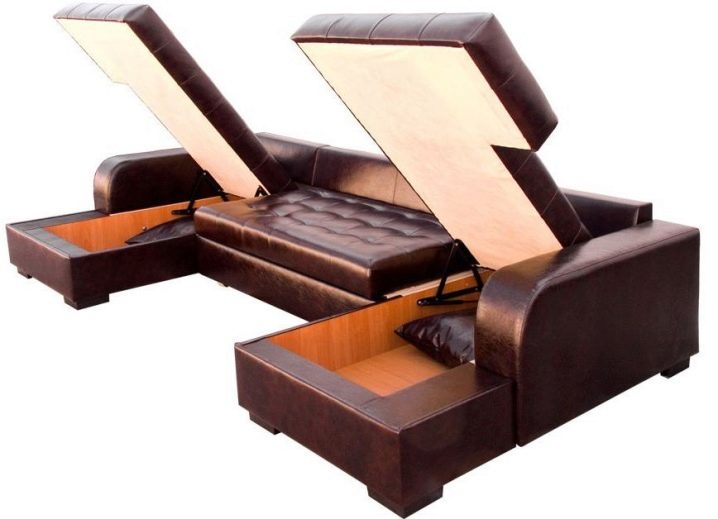 В някои модели големи ъглови дивани, в допълнение към основното чекмедже, разположено под седалката, има доста просторна кутия в долната част на ъгловия елемент. Тя може да бъде единична или двойна, наподобяваща своеобразен шкаф с две ниши. Пространството на чекмеджетата ви позволява да подредите в тях пастели и други неща, които се съхраняват в килера. Така се оказва, че се пести място за други неща..