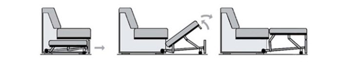 Промяна на “книгата” с малка разлика: седалката в повдигнато състояние се избутва напред и се спуска на пода, след което облегалката се спуска (издръжлив механизъм за всеки ден).
