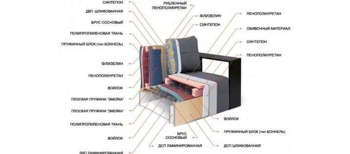 В допълнение към основните компоненти на опаковката, производителите използват допълнителни слоеве, сред които най -популярните суровини са холофайбър, струтофибър, кокосови влакна, филц, синтепон, синтепон. Към повърхността или седалката се добавят твърди материали, синтетичният зимувател и синтепонът се използват по -често за странични стени (подлакътници) и декоративни възглавници.