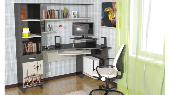 - Ъглов модел. Тази таблица е за предпочитане, тъй като ви позволява да спестите квадратни метри. Това е идеално за малки пространства. Ъгловите опции често включват горни рафтове, долни и странични секции и шкафове за книги и хартии;