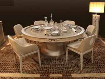 Кръглите маси изглеждат невероятно впечатляващи в интериора. Този тип конструкция е възможно най -безопасен, тъй като изобщо няма ъгли. Красива кръгла маса ще се превърне в истинска декорация на просторна всекидневна или трапезария, направена в класически стил..