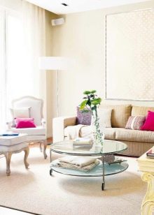 Ако тя е доминирана от геометрични фигури, присъщи на класическите посоки, тогава квадратната маса ще бъде подходяща. Ако се използва модерен стил, тогава масата може да бъде с произволна асиметрична форма. Тъй като масичката за кафе заема централно място в стаята, можете да изберете всяка форма, която харесвате, и да регулирате интериора за нея.