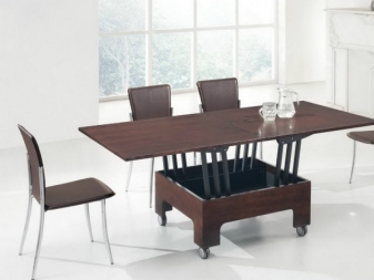 - Трансформираща се маса ще стане незаменима в малка кухня, защото дава възможност не само да се променя височината, като се регулира височината на столовете, но и да се променя площта на плота, ако са необходими нови седалки.