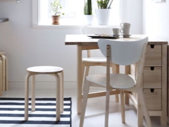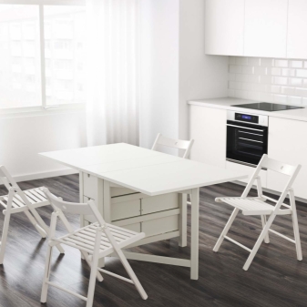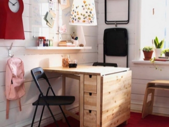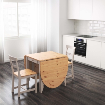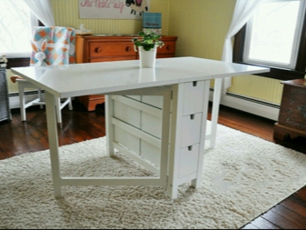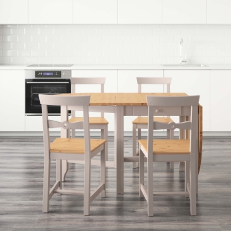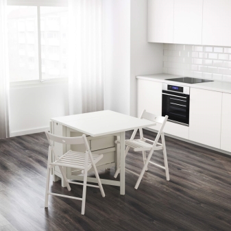 - Помещения. Изборът на модел зависи и от предназначението на помещението, където планирате да поставите този атрибут. Така, за кухня моделът Gamleby, който има доста широка неподвижна част, е перфектен. Зад него можете спокойно да настаните двама души, без да се сгъвате. Хвърляйки страничните решетки, получавате голяма маса за хранене за 6 души. Освен това има удобно чекмедже под неподвижния работен плот, където можете да съхранявате прибори за хранене..