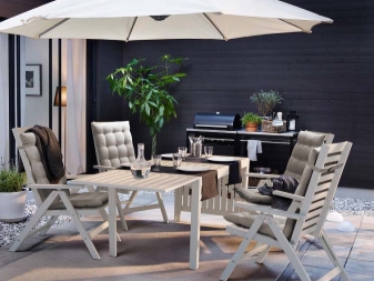 - За тераса или градина можете да закупите модела Eplaro. Неговият плот е направен от тънки ламели, което му позволява да изсъхне бързо, дори ако вода попадне върху продукта. Този атрибут се изпълнява в няколко варианта: с две седалки, ако стационарната част отсъства и само една лента е сгъната назад, четири, ако масата има две странични клапани и тясна неподвижна част, или осем, с широка лента в средата.